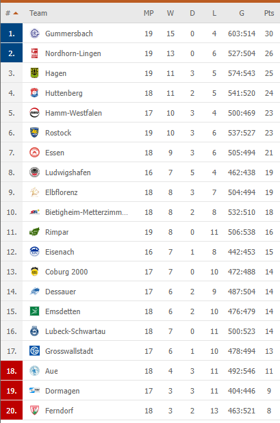 Pirmauja: „Gummersbach“ – 30, „Nordhorn“ – 26, „Eintracht“ – 25, „Huttenberg“ – 24, … „Elbflorenz“ – 19, … „Coburg“ – 14, „Grosswallstadt“.