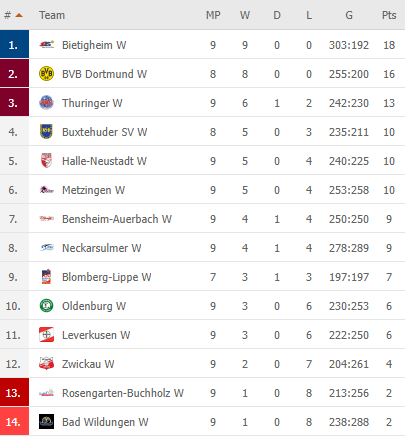 Pirmauja: „Bietigheim“ – 18, „Borussia“ – 16, „Thuringer“ – 13, … „Bayer“ – 6.
