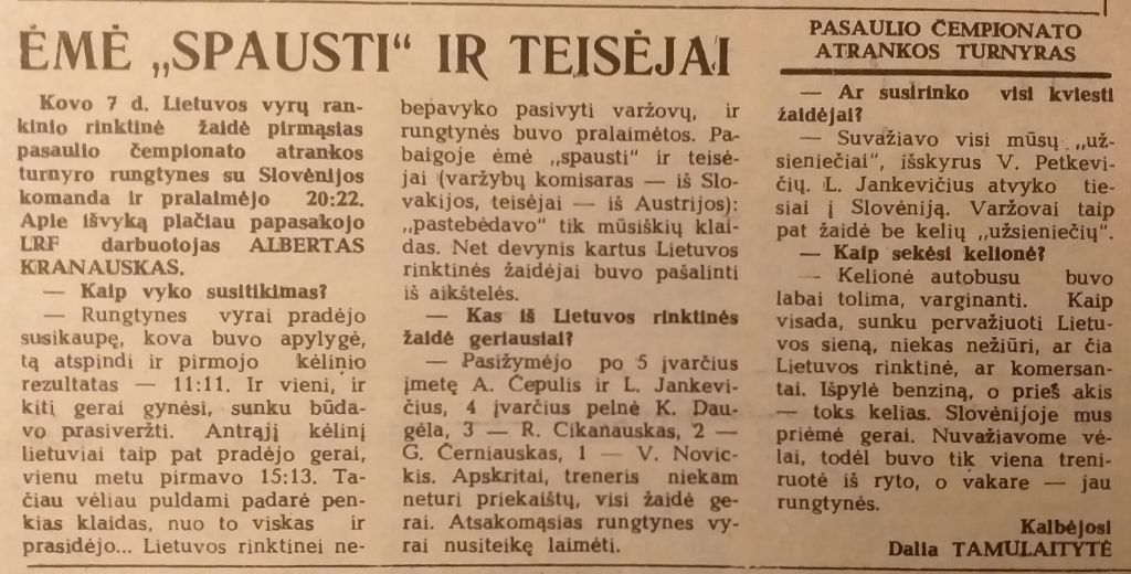 Slovėnijos rinktinė po lygios kovos nugalėjo lietuvius 22:20 (11:11), o Lietuvos komandoje per istorines rungtynes rezultatyviausiai žaidė po 5 įvarčius įmetė Arnoldas Čepulis ir Laisvidas Jankevičius bei 4 kartus varžovų vartininką pramušęs Kazys Daugėla.