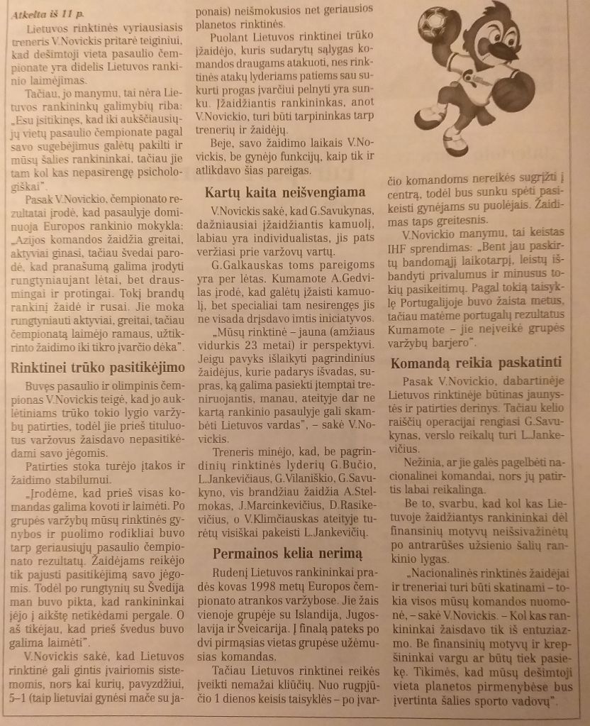 „Lietuvai didelis laimėjimas buvo patekti į pasaulio pirmenybių aštuntfinalį, rinktinės rezultatą įvertino buvęs jos treneris Antanas Skarbalius. – Tačiau keista, kad su švedais vyrai nepakovojo. Lietuvos rankininkams pritrūko patirties, todėl jie žaidė nestabiliai. Yra žaidėjų, kurie savo rinktinėms atstovavo po kelis šimtus kartų, o Lietuvos komanda tokios patirties nespėjo sukaupti.“