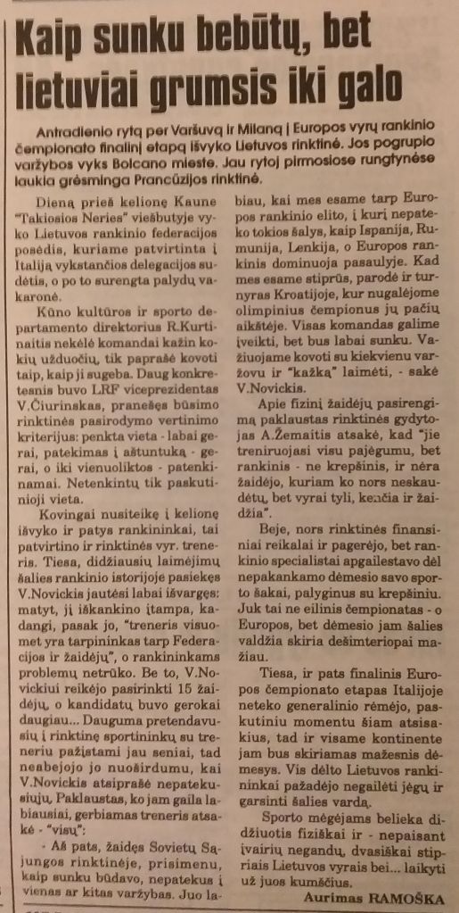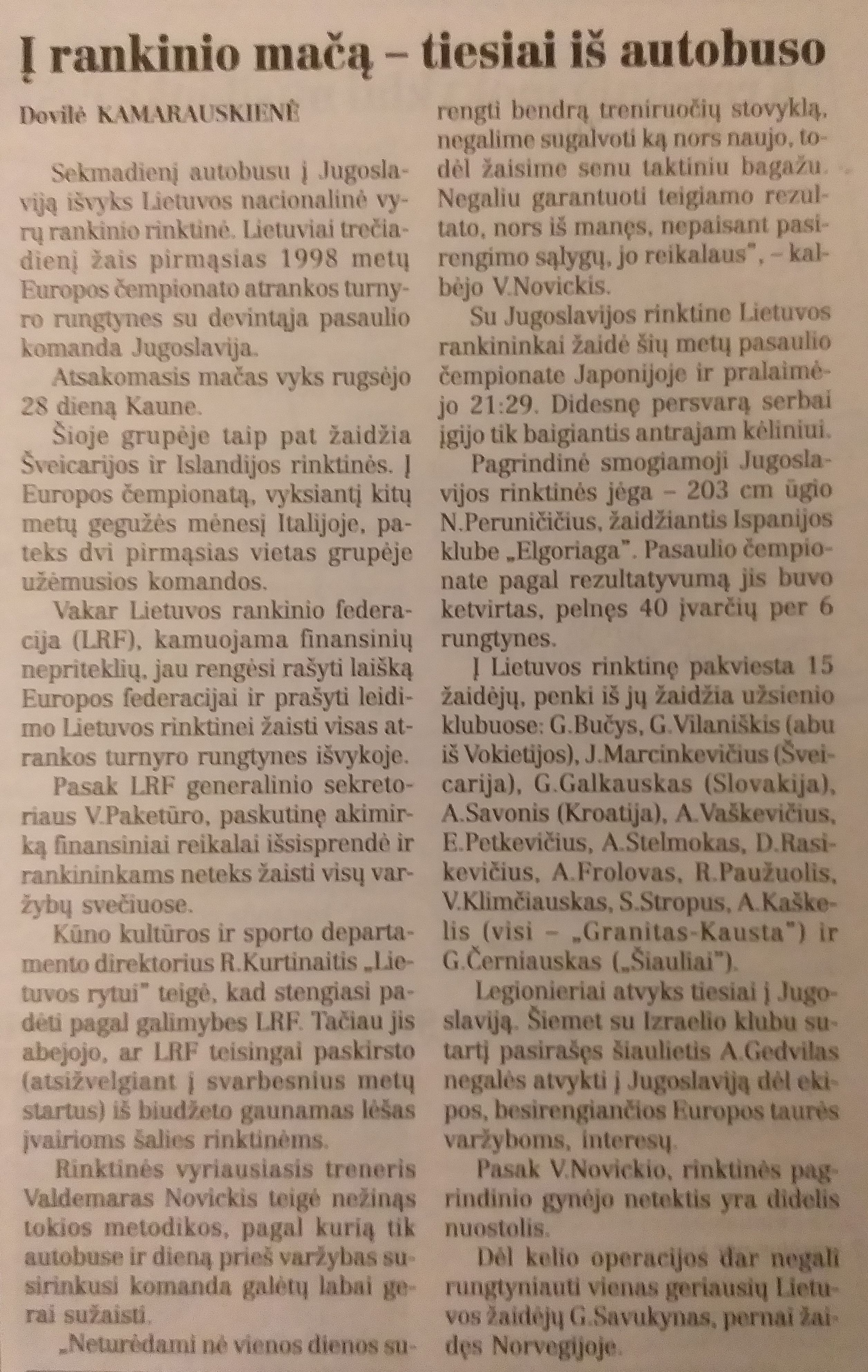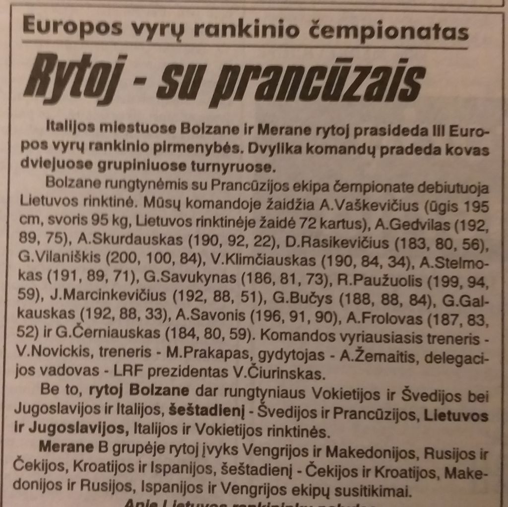 „Europos pirmenybėse rungtyniauti bus sunkiau nei pasaulio čempionate, nes pasaulio rankinio madas diktuoja europiečiai“, – ištraukus 1998 metų Europos pirmenybių burtus sakė rinktinės treneris V.Novickis.
