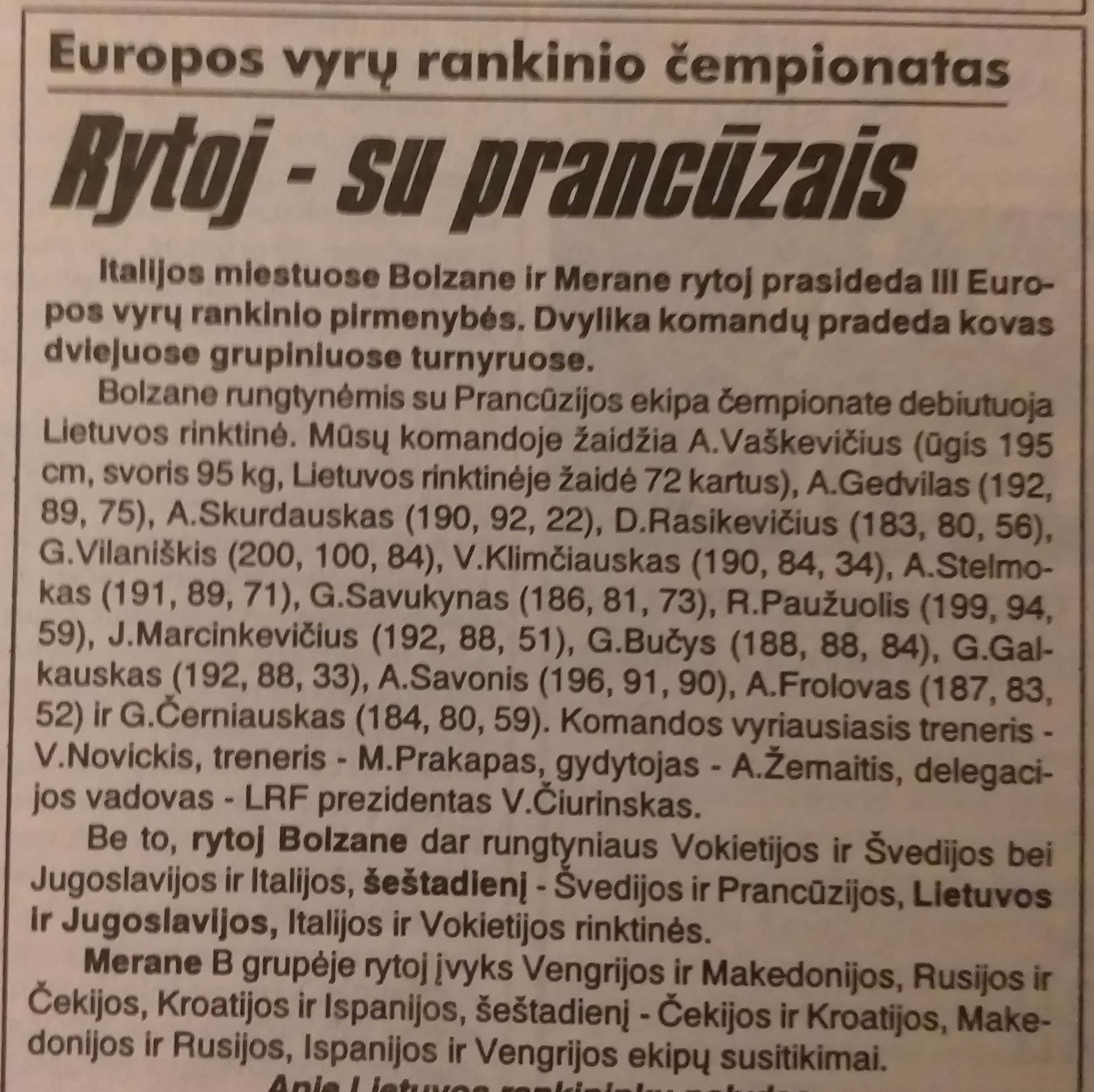 Nuo gegužės 29 iki birželio 7 dienos Pietų Tirolio miestuose Bolcane ir Merane vykusių Europos pirmenybių pirmojo etapo grupėje Lietuvos rinktinė kovojo su Jugoslavijos, Švedijos, Vokietijos, Prancūzijos ir Italijos komandomis.