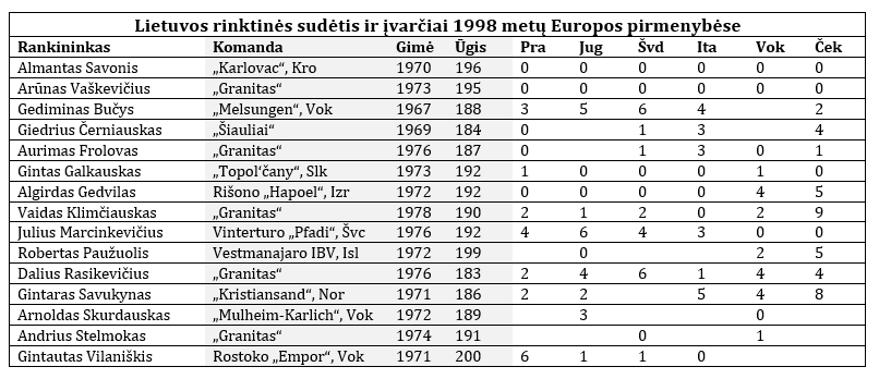 Per 1998 metų Europos pirmenybes vyriausias Lietuvos rinktinės žaidėjas buvo 31 metų Gediminas Bučys. Keliems rankininkams tuo metu buvo vos daugiau nei 20 metų, kitiems – apie 25-erius. Rinktinė buvo jauna, o žaidėjų amžius suteikė viltį, kad komanda ir toliau augs.