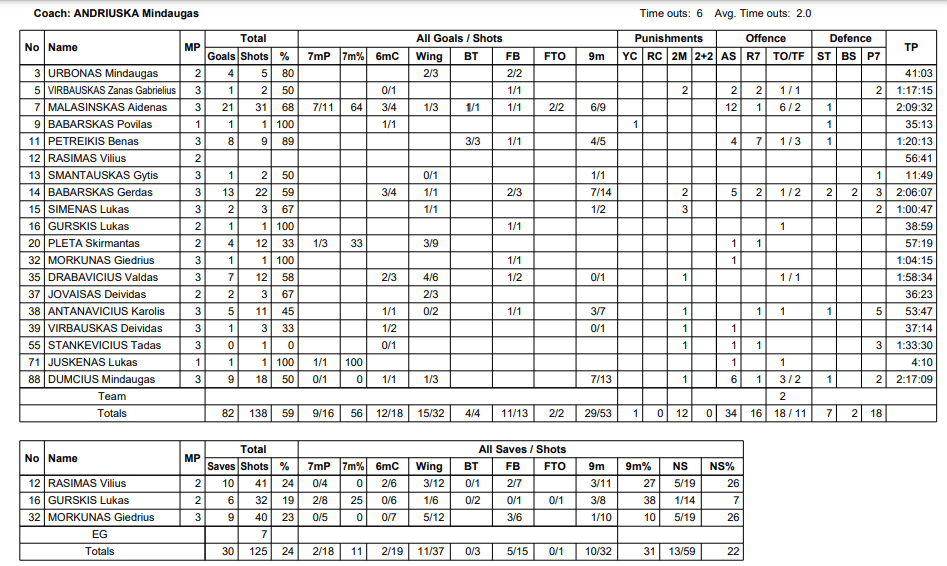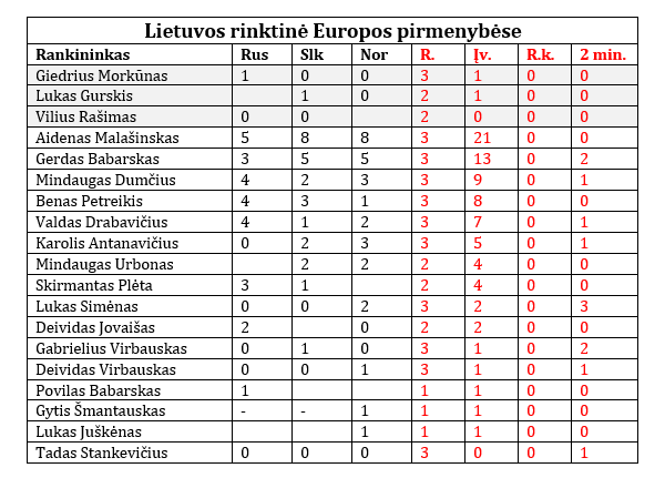Lietuvos rinktinėje žaidė 19 rankininkų. Visose trejose rungtynėse buvo registruoti 13 žaidėjų. P.Babarskas ir V.Rašimas praleido rungtynes dėl traumų.