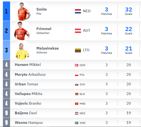 22 įvarčius pelnė austras Sebastianas Frimmelis, 21 – lietuvis Aidenas Malašinskas, po 20 – danas Mikkelis Hansenas, lenkas Arkadiuszas Moryto, slovakas Tomašas Urbanas, baltarusis Mikita Vailupavas ir juodkalnietis Branko Vujovičius.
