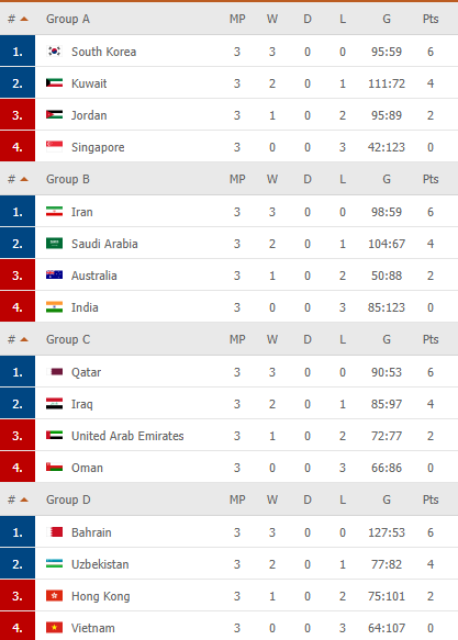 A grupė: Korėja – 6, Kuveitas – 4, Jordanija – 2, Singapūras – 0.