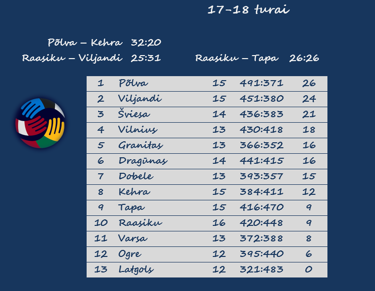 Rasiku „Mistra“ – „Tapa“ 26:26 (12:12). Žitnikovas 7, Naumenko 6 / Oolupas 10.