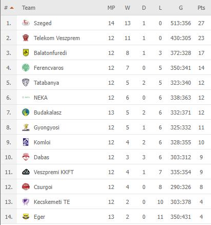 Pirmauja: „Szeged“ – 27/14, „Veszprém“ – 23/12, „Balatonfüred“ – 17/12, „Ferencvaros“ – 14/12, … „Eger“ – 4/13.