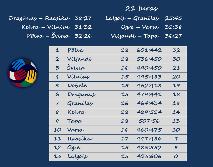 | Praleisti įvarčiai | 25 – Granitas (su Latgols) | 18 – Põlva (su Raasiku) |