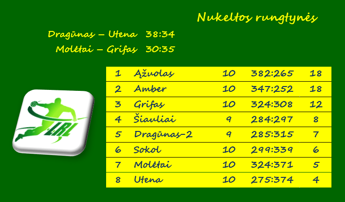 Po dviejų iš eilės nesėkmių atsitiesęs Panevėžio „Grifas“ išvykoje pranoko „Molėtus“ 35:30, o pirmą kartą šiais metais žaidę Klaipėdos „Dragūno“ dubleriai namie įveikė „Uteną“ 38:34 ir nutraukė trijų pralaimėjimų virtinę.