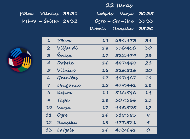 Turnyre tvirtai pirmauja „Serviti“, kuris per 19 rungtynių surinko 34 taškus, tęsia dešimties pergalių virtinę ir jau įkėlė vieną koją į finalo ketvertą. Tvirtai gali jaustis ir „Viljandi“, per 18 rungtynių iškovojęs 30 taškų.