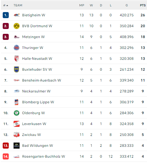 Pirmauja: „Bietigheim“ – 26, „Borussia“ – 20, „Metzingen“ – 18, … „Bayer“ – 9.