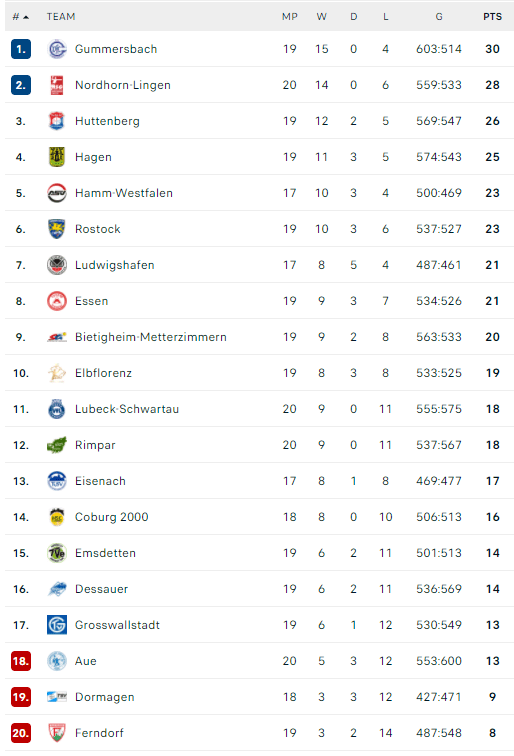 Pirmauja: „Gummersbach“ – 30, „Nordhorn“ – 28, „Huttenberg“ – 26, … „Elbflorenz“ – 19, … „Coburg“ – 16, … „Grosswallstadt“ – 13.