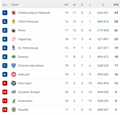 Pirmauja: Čechovo „Medvedi“ – 34, CSKA – 28, Permės „Medvedi“ – 26, „Kazaki“ – 25, „Neva“ – 19.