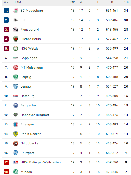 Pirmauja: „Magdeburg“ – 34, „Kiel“ – 30, „Flensburg“ – 28, „Füchse“ – 27, „Wetzlar“ – 24, … „N-Lübbecke“ – 10.