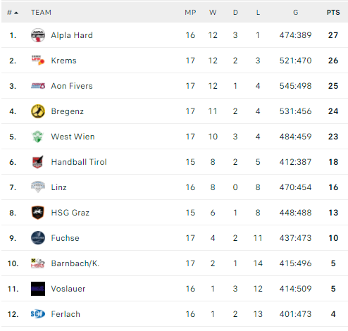 Pirmauja: „Alpla“ – 27, „Krems“ – 26, „Fivers“ – 25, „Bregenz“ – 24, „Insignis“ – 23.