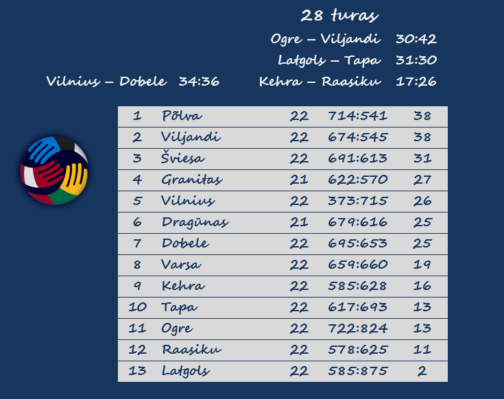 Kitose rungtynėse dėl pirmosios vietos kovojantis „Viljandi“ išvykoje įveikė „Ogre“ 42:30, o Rasiku „Mistra“ svečiuose nugalėjo Kehros „Horizon“ 26:17 ir pakartojo šio Baltijos lygos sezono mažiausiai praleistų įvarčių rekordą.