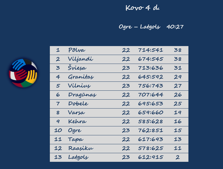 „Ogre“ – Ludzos „Latgols“ 40:27 (17:9). Pacykailikas 10, Lazdinis 6, Renfordtas 6 / Grebennikovas 8, Lipskis 6.