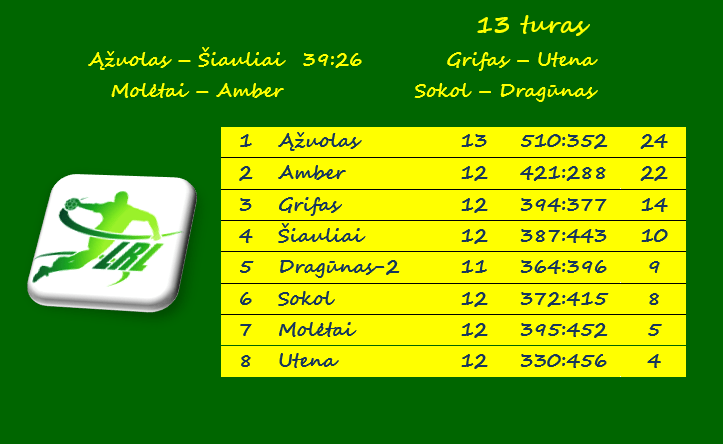 Šį savaitgalį Lietuvos rankinio lygoje žaidžiamos priešpaskutinio 13-ojo turo rungtynės. Turas prasidėjo penktadienį Garliavoje, kur lyderis Kauno „Ąžuolas“ įtikinamai nugalėjo „Šiaulius“ 39:26 (16:15).