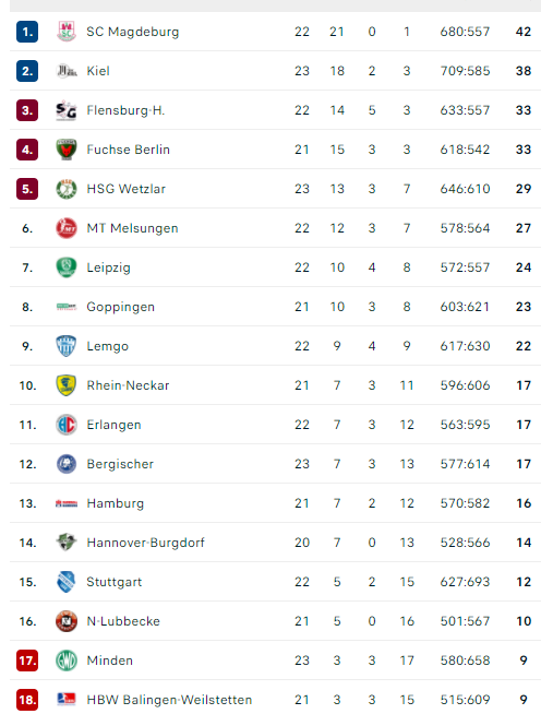 Pirmauja: „Magdeburg“ – 42, „Kiel“ – 38, „Füchse“, „Flensburg“ – po 33, … „N-Lübbecke“ – 10.
