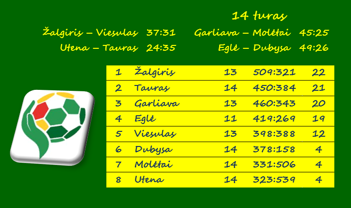 14-asis turas buvo ramus, nes visose ketveriose rungtynėse favoritės žaidė su apatinio ketverto komandomis. Sunkiausiai nugalėjo Kauno „Žalgiris“, namie įveikęs Klaipėdos „Viesulą“ 37:31 (17:14). Vilniaus „Tauras“ išvykoje nugalėjo „Uteną“ 35:24 (16:10), „Garliava“ namie įveikė „Molėtus“ 45:25 (19:13), o Vilniaus „Eglė“ savo aikštėje pranoko Šiaulių „Dubysą“ 49:26 (21:13).