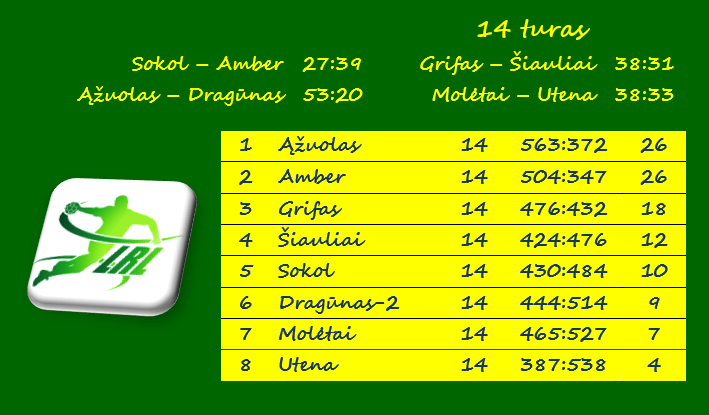 „Amber“ šeštadienį paskutiniajame ture išvykoje įveikė Šalčininkų „Sokol“ rankininkus 39:27 (18:13). Kitose paskutiniojo turo rungtynėse Panevėžio „Grifas“ namie nugalėjo „Šiaulius“ 38:31 (18:15), „Molėtai“ savo aikštėje pranoko „Uteną“ 38:33 (15:15).