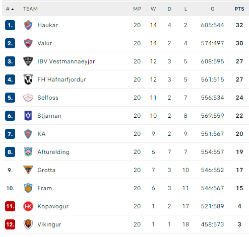Pirmauja: „Haukar“ – 32, „Valur“ – 30, IBV, FH – po 27, „Selfoss“ – 24.