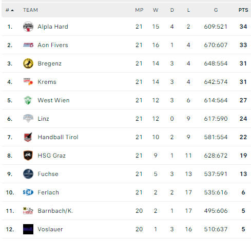 Pirmauja: „Alpla“ – 34, „Fivers“ – 33, „Bregenz“, „Krems“ – po 31, „Insignis“ – 27, „Linz“ – 24.