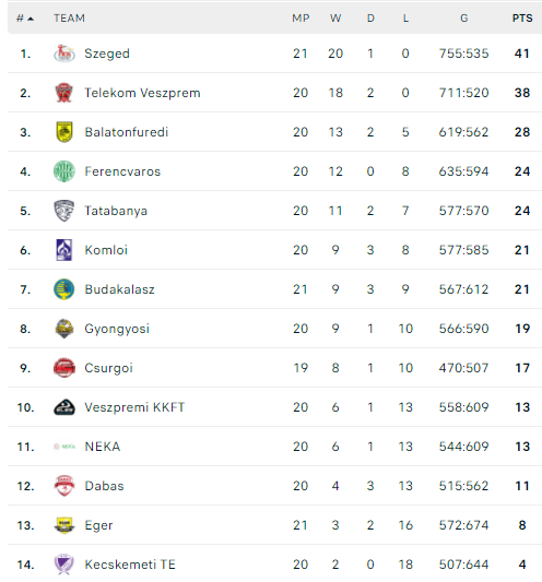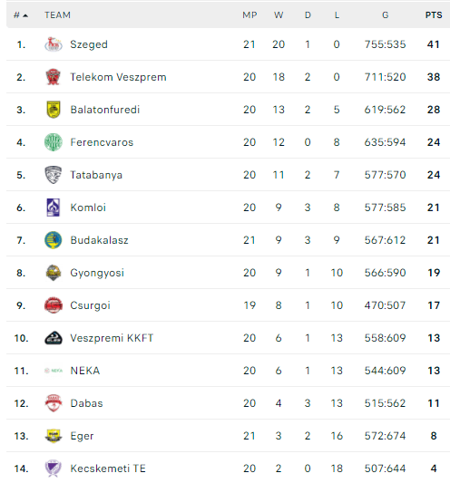 Pirmauja: „Szeged“ – 41, „Veszprém“ – 38, „Balatonfüred“ – 28, „Ferencvaros“, „Grundfos“ – po 24, … „Eger“ – 8.