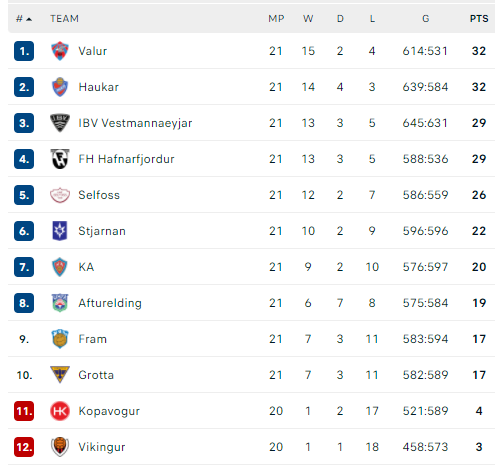 Pirmauja: „Valur“, „Haukar“ – po 32, IBV, FH – po 29, „Selfoss“ – 26.
