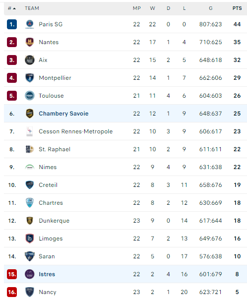 Pirmauja: PSG – 44, „Nantes“ – 35, „Aix“ – 32, „Montpellier“ – 29, „Toulouse“ – 26, „Chambery“ – 25, … „Istres“ – 8.