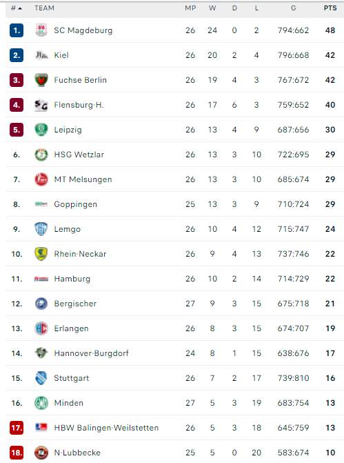 Pirmauja: „Magdeburg“ – 48, „Kiel“, „Füchse“ – po 42, „Flensburg“ – 40, „Leipzig“ – 30, … „N-Lübbecke“ – 10.