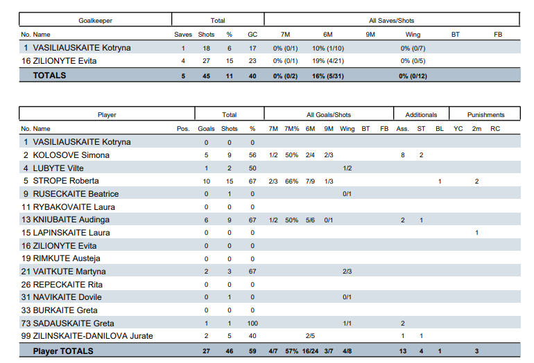 Lietuva: Stropė 10, Kniubaitė 6, Kolosovė 5, Vaitkutė 2, Žilinskaitė 2, Lubytė 1, Sadauskaitė 1, Ruseckaitė 0, Rybakovaitė 0, Lapinskaitė 0, Rimkutė 0, Repečkaitė 0, Navikaitė 0, Burkaitė 0; Žilionytė, Vasiliauskaitė.
