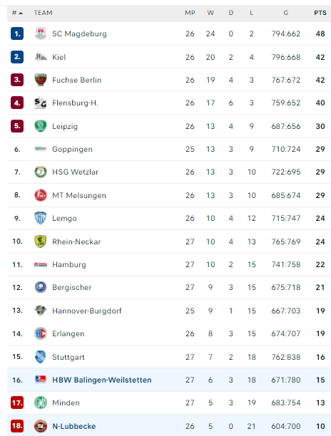Pirmauja: „Magdeburg“ – 48, „Kiel“, „Füchse“ – po 42, „Flensburg“ – 40, „Leipzig“ – 30, … „N-Lübbecke“ – 10.