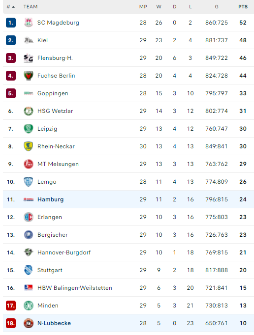 Pirmauja: „Magdeburg“ – 52, „Kiel“ – 48, „Flensburg“ – 46, „Füchse“ – 44, … „N-Lübbecke“ – 10.
