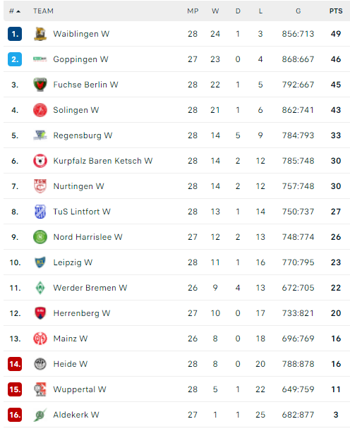 Pirmauja: „Waiblingen“ – 49, „Frisch Auf“ – 46, „Füchse“ – 45, „Solingen“ – 43.