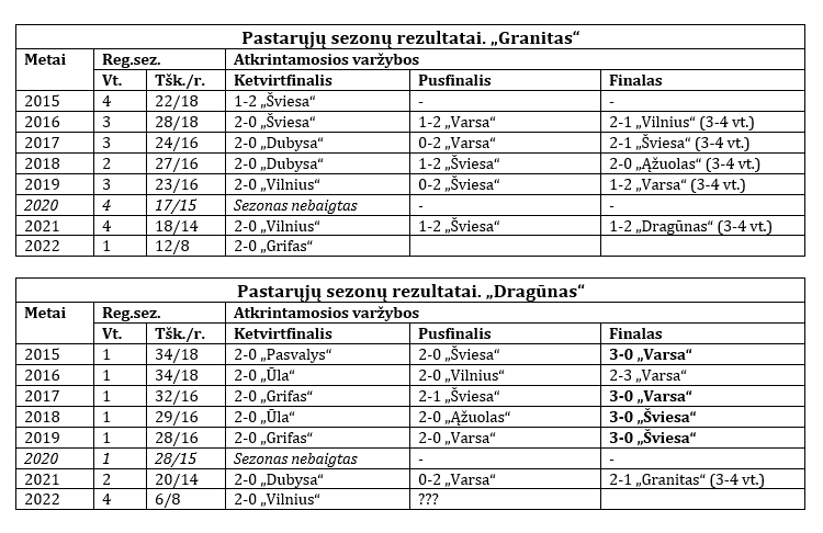Šį sezoną per penkerias tarpusavio rungtynes keturias pergales pasiekė „Dragūnas“. Baltijos lygos reguliariajame sezone komandos pasidalijo po pergalę savo salėse: „Dragūnas“ nugalėjo 30:27, „Granitas“ atsiskaitė 34:25.