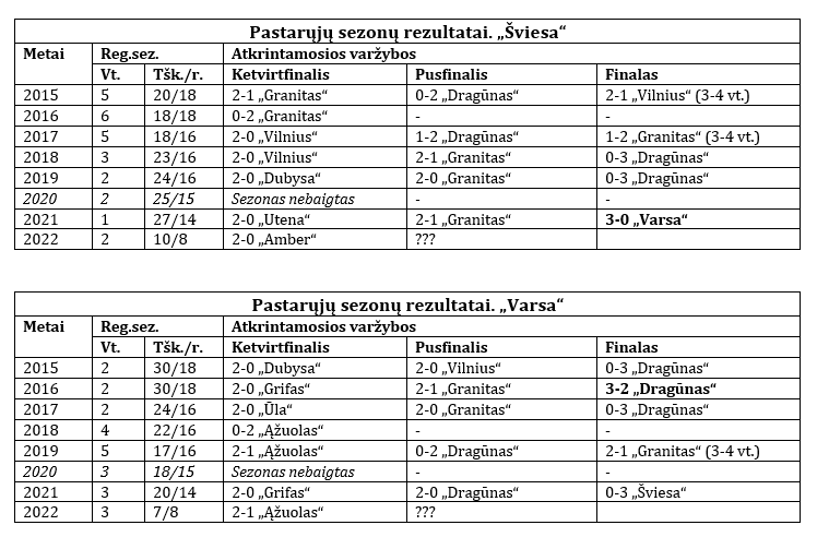 Šį sezoną komandos susitiko keturis kartus ir pasidalijo po dvi pergales. Baltijos lygos reguliariajame sezone komandos laimėjo žaisdamos išvykose: „Šviesa“ nugalėjo 28:27, „Varsa“ atsiskaitė 33:30.