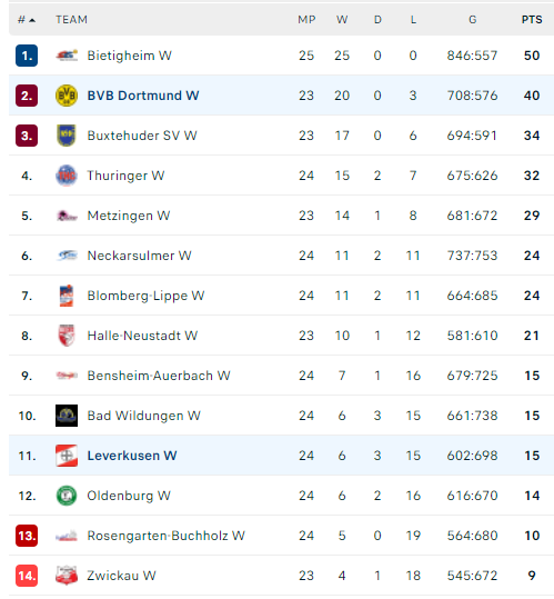 Pirmauja: „Bietigheim“ – 50, „Borussia“ – 40, „Buxtehude“ – 34, „Thuringer“ – 32, … „Bayer“ – 15.