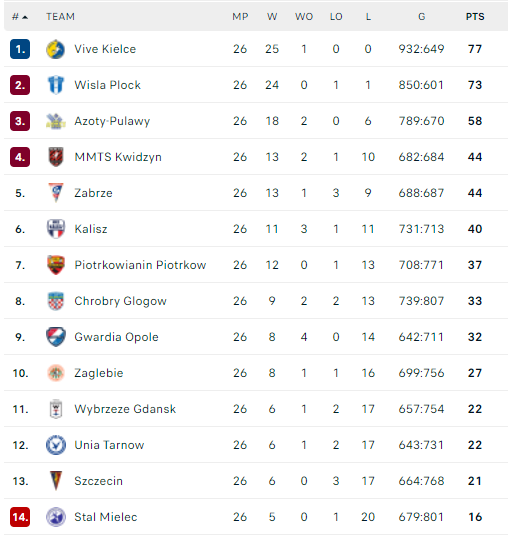 „Kielce“ per 26 rungtynes surinko 77 taškus, „Wisla“ – 73 taškus. Bronzos medalius iškovojusios Pulavų „Azoty“ sąskaitoje – 58 taškai.