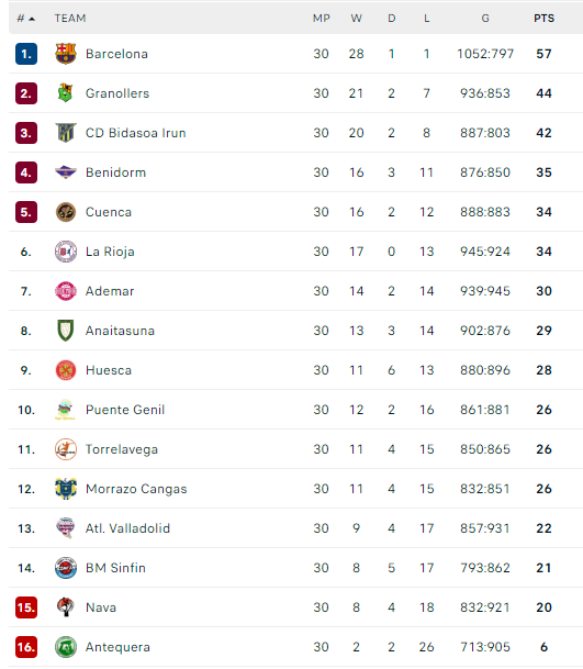 Antrajame rate „Antequera“ iš paskutinės vietos neišsikapstė. Ši komanda surinko tik 6 taškus ir jau po debiutinio sezono atsisveikino su „Asobal“ lyga.