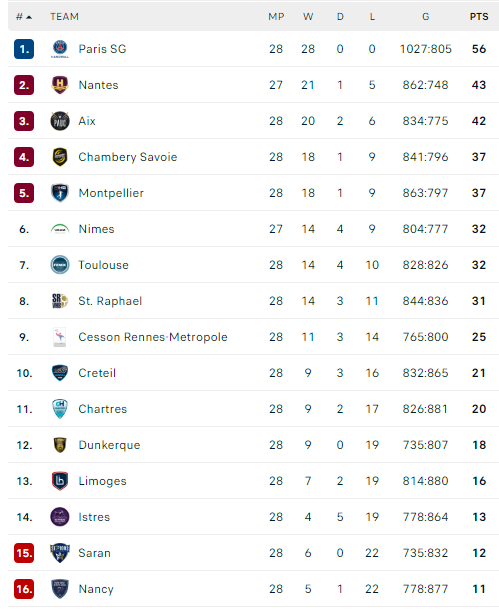 Pirmauja: PSG – 56, „Nantes“ – 43, „Aix“ – 42, „Chambery“, „Montpellier“ – po 37, „Nîmes“ – 32, … „Istres“ – 13.