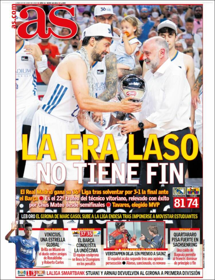 „Pablo Laso era nesibaigia“, – pirmajame puslapyje parašė „As“, ypatingai pažymėjęs Madrido komandos trenerį P.Laso, kuris pagerėjus sveikatai grįžo į komandą po birželio pradžioje patirto širdies smūgio.