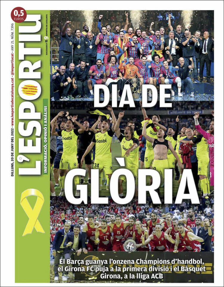 Skaitytojus sveikino Čempionų lygos nugalėtojai „Barcelona“ rankininkai, kelialapį į „La Liga“ iškovoję „Girona“ futbolininkai ir kelialapį į ACB lygą iškovoję „Girona“ krepšininkai. Prie bendros trijų komandų nuotraukos „L‘Esportiu“ didelėmis raidėmis parašė „Šlovės diena!“