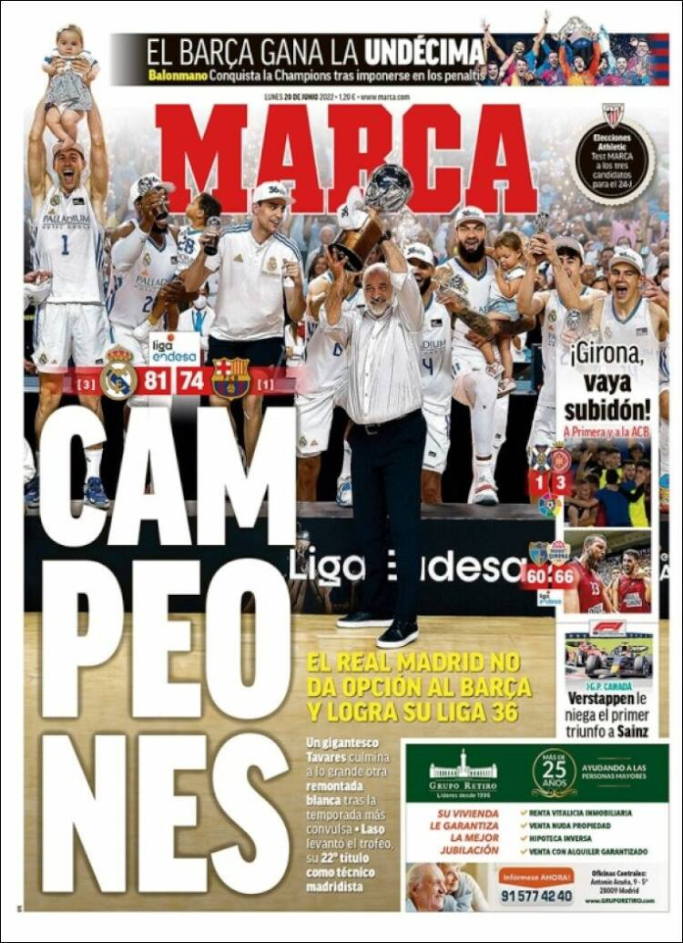 „Sport“ prie panašios rankininkų nuotraukos parašė žodį „Čempionai“. Prie susikrimtusių Roko Jokubaičio ir kitų „Barcelona“ krepšininkų nuotraukos „Sport“ išspausdino žodį „Nusivylimas“. „Nuliūdinusi „Barça“ neprivertė varžovų žaisti penktąsias finalo rungtynes ir čempionu tapo „Real“, – pridūrė „Sport“.