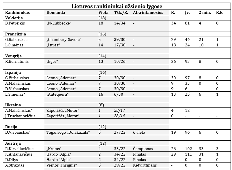 Lietuvos rankininkai šį sezoną žaidė keturiose iš penkių stipriausių Europos nacionalinių lygų (Vokietijos, Prancūzijos, Vengrijos ir Ispanijos), bet jose negalėjo pasigirti dideliais laimėjimais. Kone svariausiu pasiekimu stipriausiose lygose džiaugėsi Gerdas Babarskas, padėjęs „Chambery-Savoie“ (Prancūzija) komandai iškovoti kelialapį į Europos lygą.