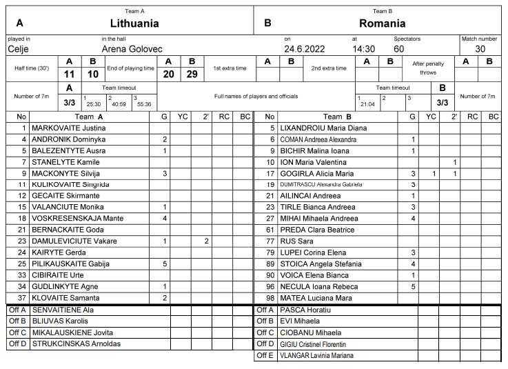 Lietuva – Rumunija 20:29 (11:10). Pilikauskaitė 5, Voskresenskaja 4, Mackonytė 3, D.Andronik 2, Klovaitė 2, Baležentytė 1, Valančiūtė 1, Damulevičiūtė 1, Gudlinkytė 1.