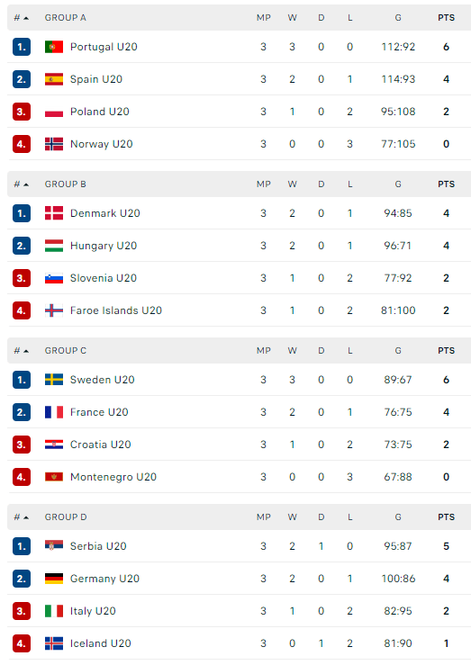 Antrojo etapo 1-ojoje grupėje žais Danija, Portugalija (po 2 taškus), Ispanija ir Vengrija (po 0), 2-ojoje grupėje – Švedija, Serbija (po 2), Vokietija ir Prancūzija (po 0). Po dvi geriausias antrojo etapo grupių komandas pateks į pusfinalį.