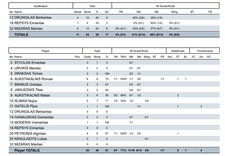 Lietuva – Kosovas 28:17 (12:7). R.Aukštikalnis 6, Slimas 5, Petronis 4, Drakšas 3, Janušonis 3, M.Aukštikalnis 3, Biknius 2, Gatelis 1, Moderis 1 / Berisha 7.