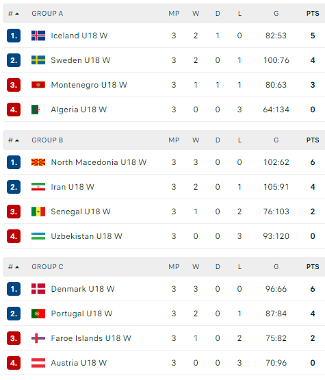 Pirmajame etape po tris pergales iškovojo Šiaurės Makedonijos, Danijos, Egipto, Korėjos, Norvegijos ir Vengrijos rankininkės. Į kitą etapą taip pat pateko Islandijos, Švedijos, Irano, Portugalijos, Kroatijos, Nyderlandų, Rumunijos, Vokietijos, Brazilijos ir Prancūzijos rinktinės.